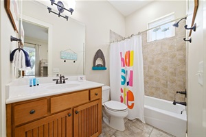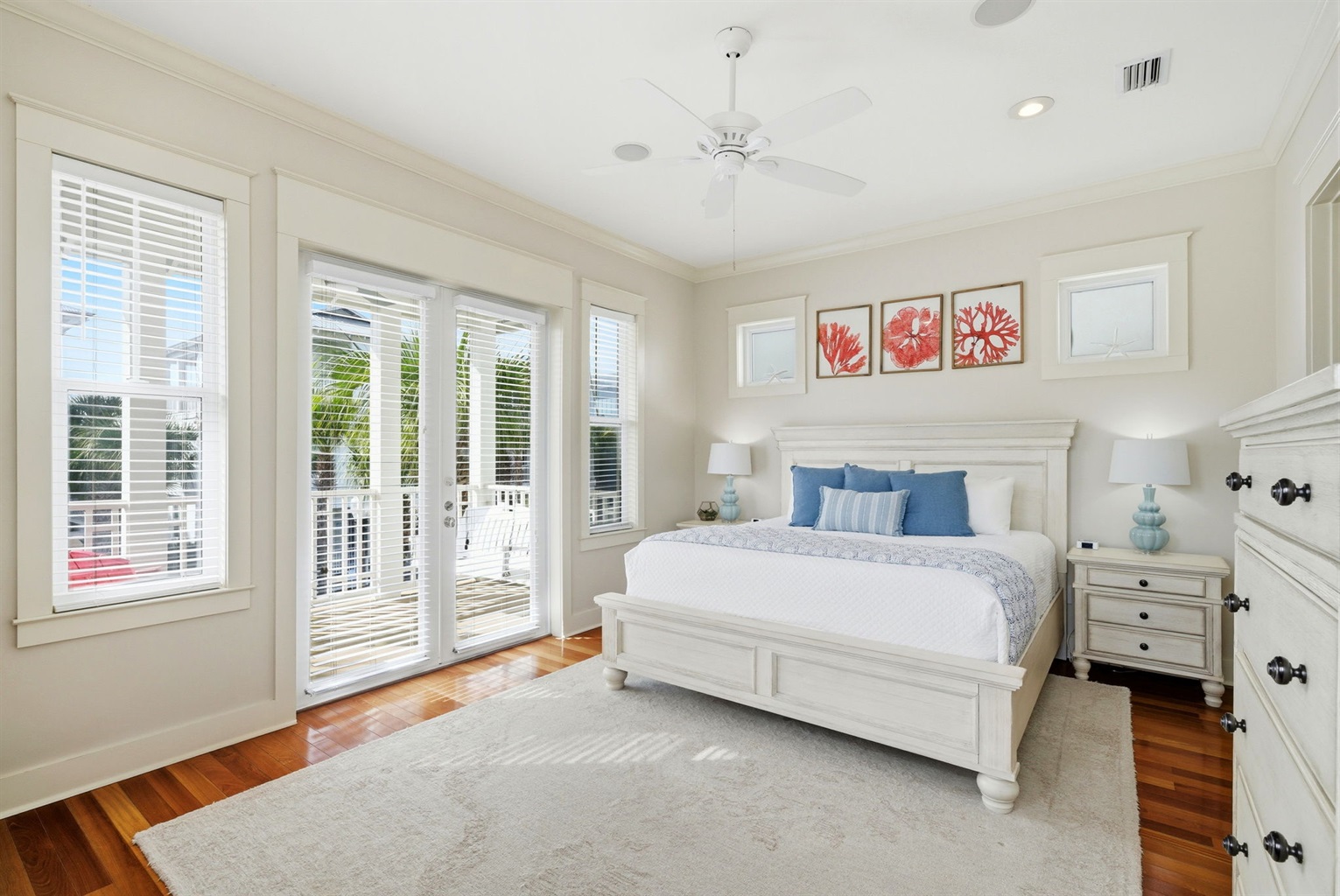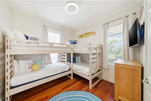 Modern comfort meets coastal charm in the main level master, complete with a flat-screen TV and private ensuite access.